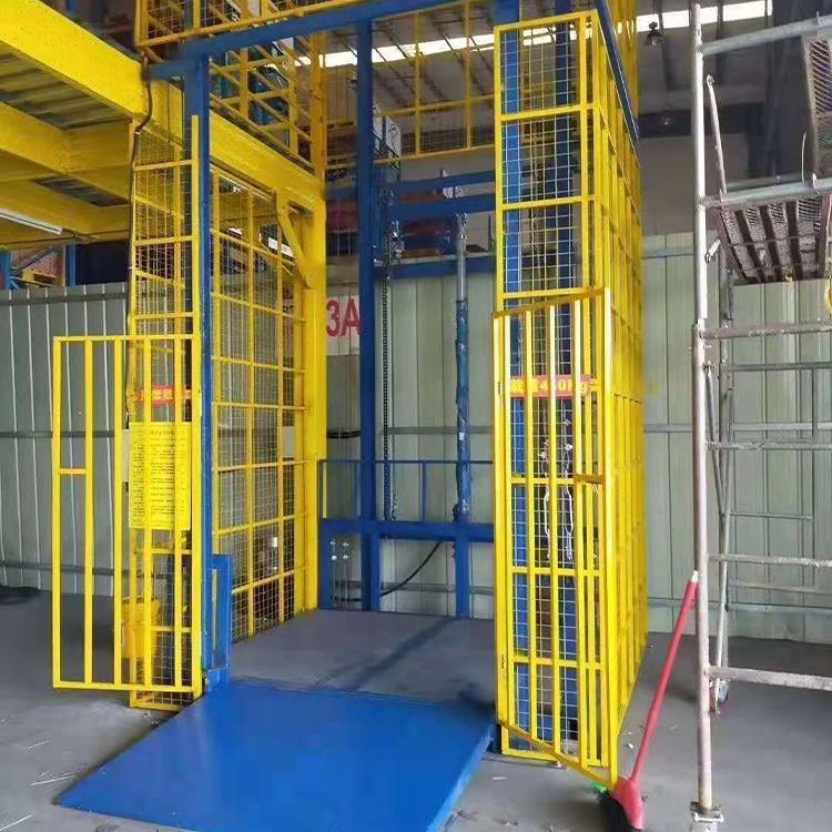 廠房升降貨梯液壓系統的組成由防墜、上下層門互動連鎖看,可以實現多樓層的控制;同時設有溢流閥、手動泵、管路破裂閥等安全裝置使得設備的安全性能有極大的保障。對于導軌式升降機的臺面設計,臺面以防滑紋鋼板材料,臺面平整且防滑耐用。